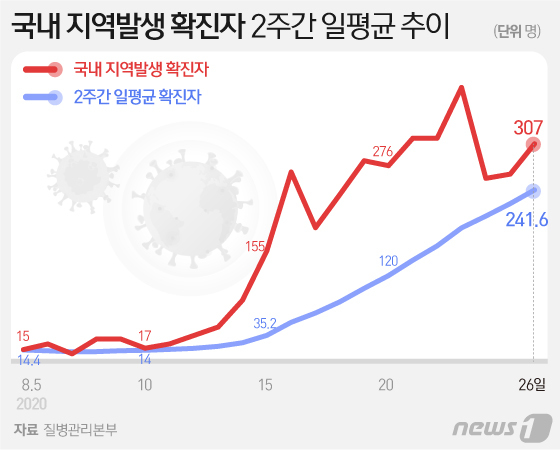 국내발생 지자체 14곳…2주간 일평균 241.57명, 200명 넘어