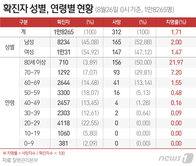 누적 사망자는 전날보다 2명 증가한 312명으로 나타났다. 이에 따라 전체 치명률은 1.71%를 기록했다. 성별 치명률은 남성 2%, 여성은 1.47%고, 연령별로는 80세 이상 치명률이 21.97%로 가장 높다.