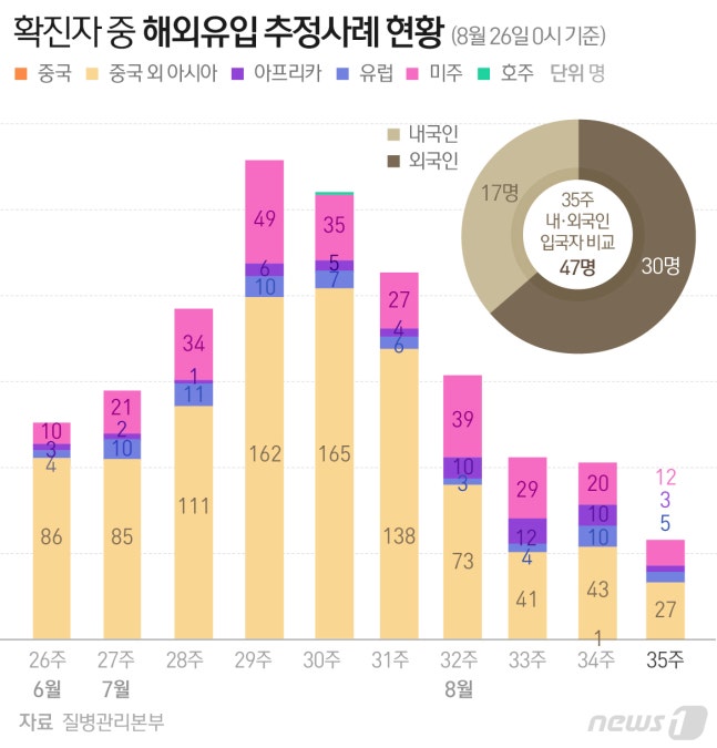 이날 0시 기준 해외유입 확진자는 13명을 기록했다. 지역사회 10명, 검역단계 3명이다. 해외유입 확진자의 유입국가는 대륙별로 중국외 아시아 7명, 아메리카 3명, 아프리카 3명이다. 국적별로는 내국인 7명, 외국인 6명을 기록했다.