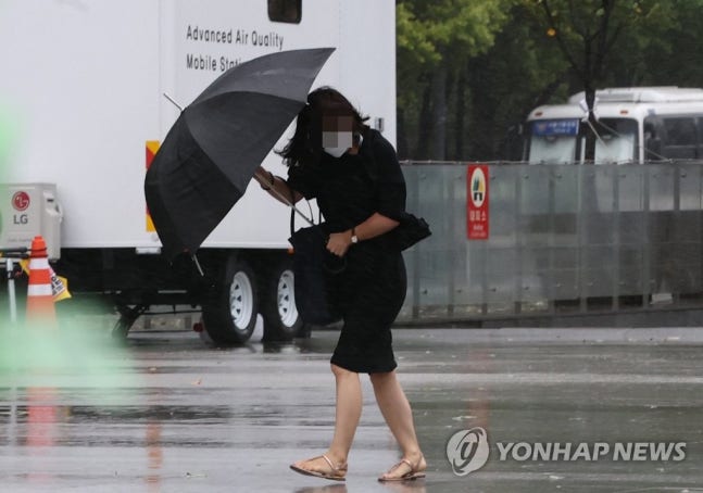 (서울=연합뉴스) 류영석 기자 = 9호 태풍 마이삭이 북상 중인 3일 오전 서울 광화문광장에서 시민이 비바람을 맞고 있다. 2020.9.3
