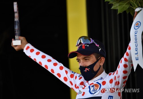 Team Ineos Grenadiers cyclist Richard Carapaz of Ecuador in the Polka Dot jersey of the best climber during the podium ceremonies after the 18th stage of the Tour de France over 175km from Meribel to La Roche-sur-Foron, France, 17 September 2020. EPA/Anne-Christine Poujoulat / Pool