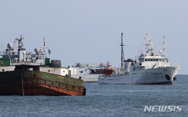 [연평도=뉴시스] 최진석 기자 = 군은 24일 실종된 해양수산부 공무원이 북한에 의해 사살·화장 사건과 관련, 해당 공무원이 북한의 신종 코로나바이러스 감염증(코로나19) 방역 조치에 따라 사살되고 시신이 불태워지기까지 했다고 밝혔다. 사진은 24일 인천시 옹진군 연평도 해상에 정박된 실종 공무원이 탑승했던 어업지도선 무궁화 10호. 2020.09.24. myjs@newsis.com