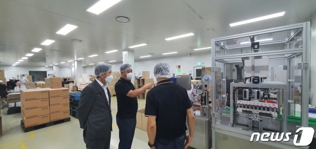 한밭대 최병욱(맨 왼쪽) 총장이 에프에이를 방문해 남윤재 대표(가운데)로부터 생산설비와 제픔에 대한 설명을 듣고 있다 © 뉴스1(대전ㆍ충남=뉴스1) 최영규 기자 = 한밭대는 의료기기 제조업체 ㈜에프에이가 재학생 코로나19 예방을 위해 마스크 1만장을 기증했다고 25일 밝혔다.
