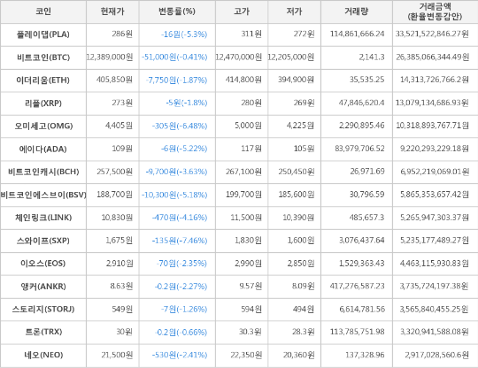 비트코인, 플레이댑, 이더리움, 리플, 오미세고, 에이다, 비트코인캐시, 비트코인에스브이, 체인링크, 스와이프, 이오스, 앵커, 스토리지, 트론, 네오 [표]가상화폐 시세 (제공: 암호화폐 거래소 업비트)