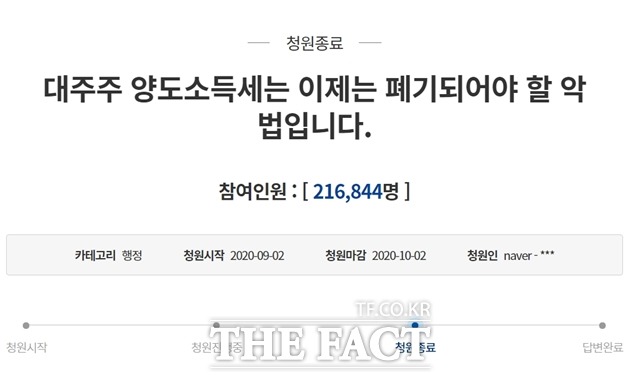 대주주 요건 변경 소식을 접한 개인투자자들 사이에서는 반발이 빗발치고 있다. 급기야 청와대 국민청원 게시판에 게시글이 올라왔다. 지난달 2일 청와대에 올라온 '대주주 양도소득세는 이제는 폐기되어야 할 악법입니다'라는 게시 글에는 지난 3일 기준 21만 명 이상이 동의했다.