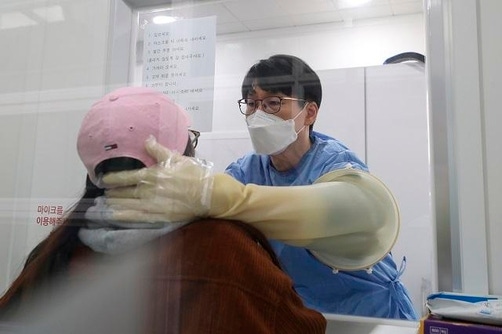 신종 코로나바이러스감염증(코로나19) 신규 확진자가 닷새 연속 두 자릿수로 집계된 5일 서울 서초구 보건소에 마련된 선별진료소에서 의료진이 검체 채취를 하고 있다. /뉴시스환진된 14명은 입원환자 7명, 보호자 4명, 간병인 2명, 간호사 1명 등이다.