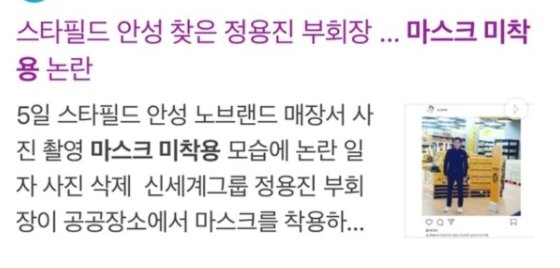 이 같은 ‘발끈 게시물’에는 2000개가 넘는 댓글이 달렸다. 정 부회장의 ‘사이다 항변’을 옹호하는 반응이 대부분이었다. 신세계 측은 “한 방문객의 요청으로 사진 촬영을 할 때만 잠깐 벗었을 뿐 이외 대부분 마스크를 썼다”는 설명이다. 일반인의 요청에도 기꺼이 마스크를 벗는 소탈한 행보는 ‘친절한 용진씨’라고 불릴 만하다.