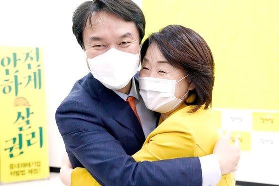 김종철 정의당 신임 대표(왼쪽)가 11일 서울 여의도 국회에서 열린 이·취임식에서 심상정 전 대표와 포옹하고 있다. 오종택 기자 김종철 정의당 대표는 11일 “더불어민주당과 정의당이 우리 국민을 위한 선의의 경쟁을 할 때 우리 국민들은 더 행복해질 수 있다”고 말했다. 김 대표는 이날 신임 대표 및 6기 대표단 취임사에서 이낙연 민주당 대표가 “정의당이 진보적인 정책의제를 제안해줄 것을 기대하겠다”고 축하 인사를 한 데에 감사를 표하면서 “선의의 경쟁을 시작하자”고 했다. 이어 “정의당이 제출한 ‘중대재해기업처벌법’ 제정에 함께 해주시기 바란다”고 덧붙였다.