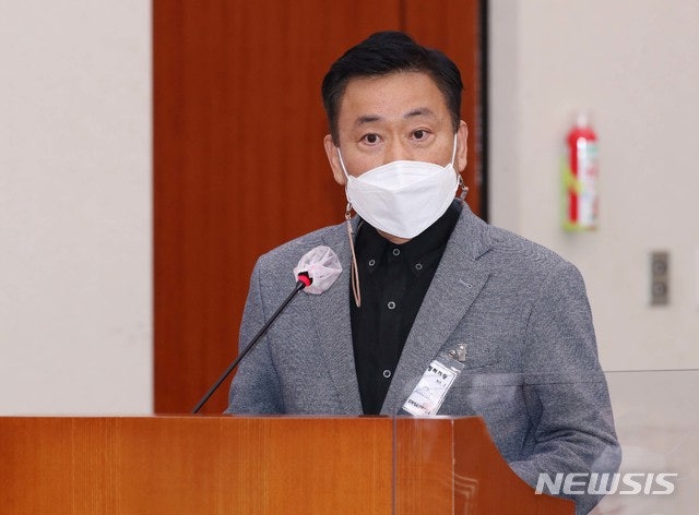 [서울=뉴시스]최동준 기자 = 손세원 성남시청 빙상감독이 15일 국회에서 열린 문화체육관광위원회의 대한체육회 등에 대한 국정감사에 증인으로 출석, 의원 질의에 답변하고 있다. (공동취재사진) 2020.10.15.