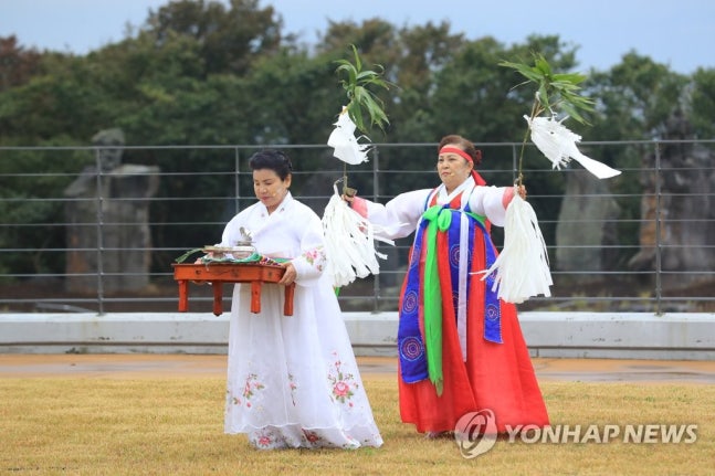 (제주=연합뉴스) 박지호 기자 = 16일 오후 제주시 조천읍 교래리 돌문화공원에서 '설문대 아리랑' 공연이 열리고 있다. 2020.10.16
