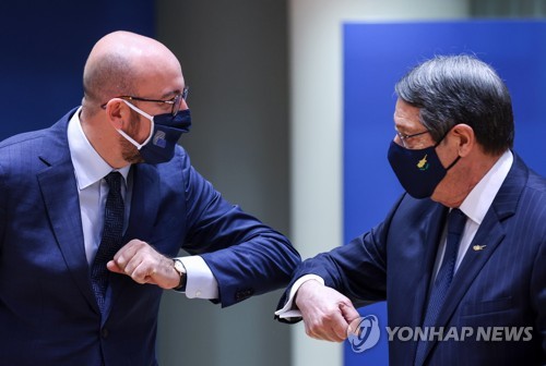 Cyprus' President Nicos Anastasiades (R) and President of the European Council Charles Michel (L), wearing face masks, greet each other with an elbow bump on the second day of a two days face-to-face EU summit, in Brussels, Belgium, 16 October 2020. EPA/KENZO TRIBOUILLARD / POOL