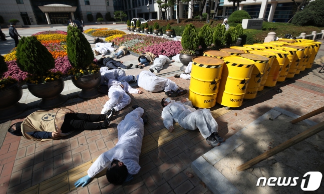 (울산=뉴스1) 윤일지 기자 = 탈핵울산시민공동행동, 부산에너지정의행동 등 구성원들이 26일 울산시청 앞에서 기자회견을 열고 핵폐기물의 위험성과 부실, 졸속 공론화 문제를 알리기 위해 '대한민국 방방곡곡 가져가라 핵페기물' 퍼포먼스를 펼치고 있다. 2020.10.26/뉴스1