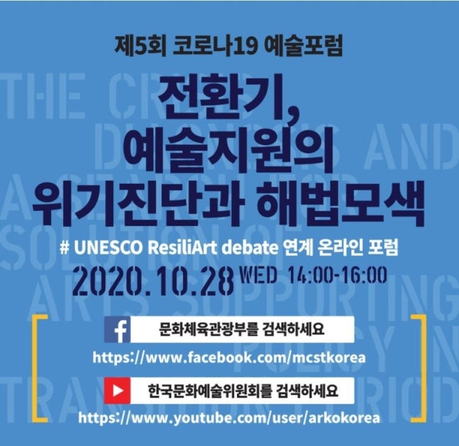 이번 토론회는 문체부가 지난 7월부터 문화예술기관 7곳과 함께 진행하고 있는 '코로나19 예술포럼'의 다섯 번째 행사입니다. 무관중으로 진행되며 문체부 페이스북과 문예위 유튜브를 통해 생중계합니다.