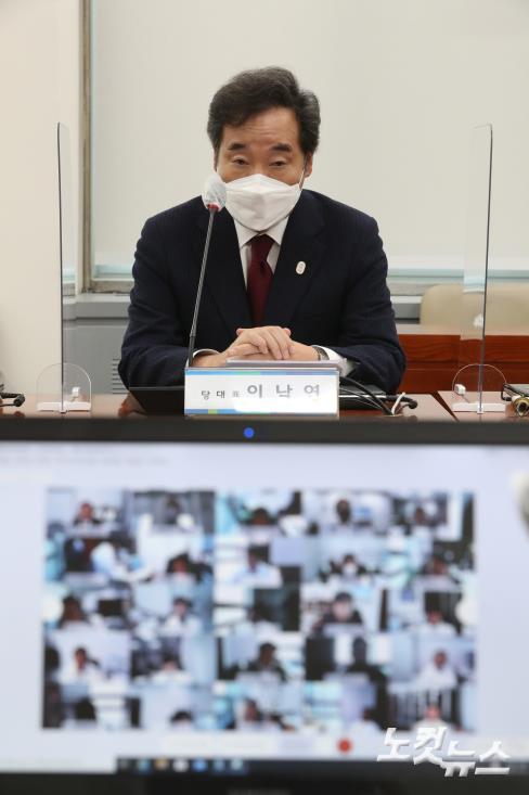 더불어민주당 이낙연 대표가 27일 오전 서울 여의도 국회에서 열린 제18차 온택트 의원총회에 참석해 김태년 원내대표의 인사말을 듣고 있다.