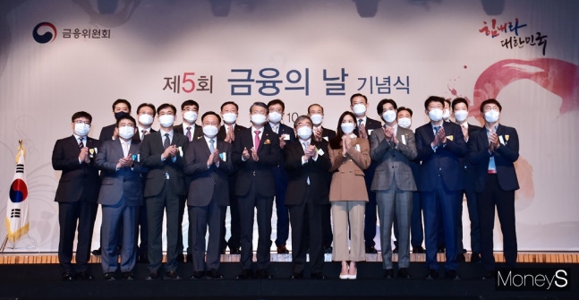 은성수 금융위원장, 윤석헌 금융감독원장, 김태영 전국은행연합회장 등 인사들이 27일 서울 여의도 63컨벤션센터에서 열린 '제5회 금융의날 기념식'에 참석, 배우 고소영, 가수 유노윤호(본명 정윤호)를 비롯한 수상자들과 기념촬영을 갖고 있다.