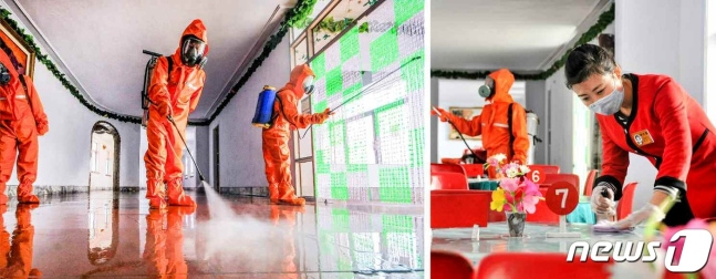 (평양 노동신문=뉴스1) = 북한 노동당 기관지 노동신문은 28일 전국 각지의 신종 코로나바이러스 감염증(코로나19) 비상 방역사업을 조명했다. 사진은 평안북도 박천군에서 소독 사업을 진행하고 있는 노동자들의 모습.