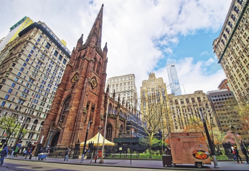 300년 이상의 역사와 전통을 지닌 미국 뉴욕 월스트리트의 트리니티교회. 세계 금융의 중심지 속에 놓인 교회의 모습이 이채롭다. 게티이미지기독교를 기준 삼아 미국의 종교지형도를 세밀하고도 방대하게 그려낸 책이다. 미국 기독교 역사 연구의 전설로 불리는 시드니 알스트롬(1919~1984)이 10년간 집필해 1972년 발간했다. 지금도 미국 기독교사의 교과서로 꼽힐 정도로 빼어난 책이다. 분량도 예사롭지 않다. 1584쪽. 흔히 말하는 ‘벽돌책’이다.