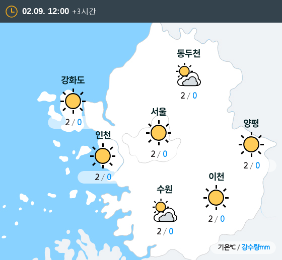 2020년 02월 09일 12시 수도권 날씨 강화도 : 맑음, 기온 : 2℃, 강수량 : 0mm