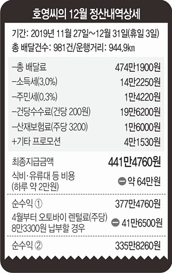 이 돈은 {(기본 배달료 3000원+프로모션비α)×배달 건수}를 단순 계산한 금액이다. 실제 손에 쥐는 건 그보다 훨씬 적다. 배민은 여기서 건당 200원의 수수료, 소득세 3%와 주민세 0.3%, 주당 산재보험료 3200원을 빼고 441만4760원만 줬다.