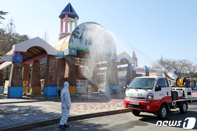 23일 오후 광주 북구 우치공원 관계자들이 놀이공원을 방역 소독하고 있다. 이날 보건당국 등에 따르면 신종 코로나바이러스 감염증(코로나19) 126번 확진자 A씨(30)의 친구 B씨가 양성 판정을 받았다. B씨는 지난 20일 우치공원을 방문 2시간가량 머문 것으로 확인됐다. 2020.2.23/뉴스1 © News1 황희규 기자(광주=뉴스1) 박준배 기자,전원 기자,한산 기자 = 광주에서 신종 코로나바이러스 감염증(코로나19) 확진환자가 6명으로 늘었다.