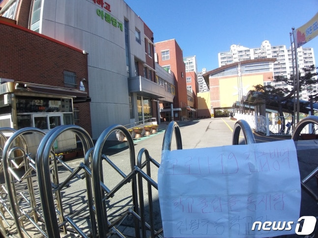 광주 남구에 위치한 진월초등학교 정문에 출입을 통제하는 안내문이 붙어있다. 2020.2.23© 뉴스1◇현직 교사 '확진 판정'…진월초 휴교조치22일 오후 확진판정을 받은 F씨는 광주 진월초등학교 현직 교사로 파악됐다. 광주전남에서 현직교사가 코로나19 확진 판정을 받은 것은 이번이 처음이다.