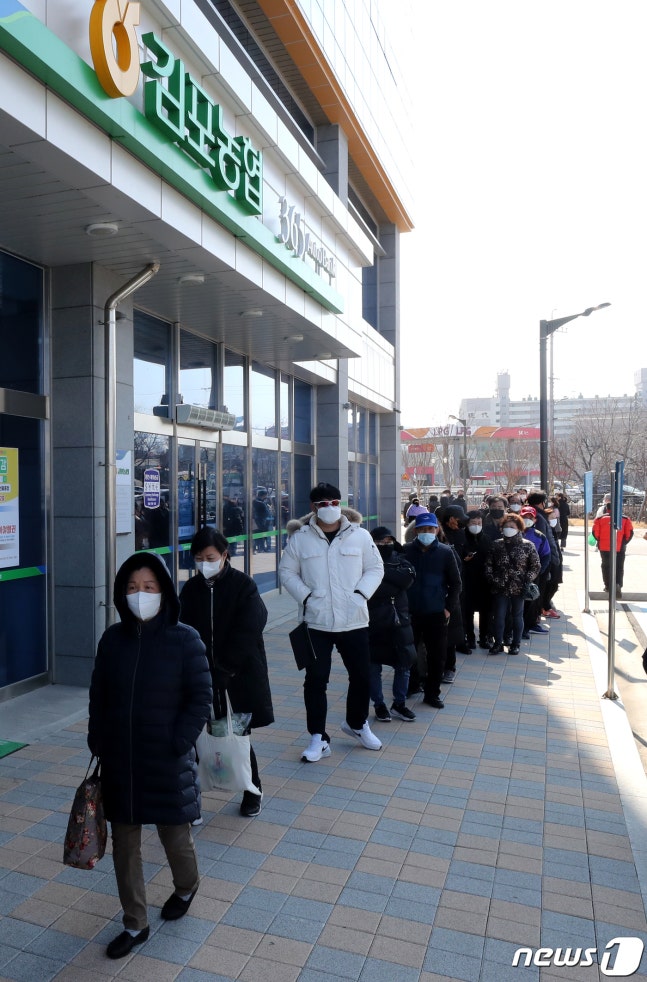 (김포=뉴스1) 정진욱 기자 = 신종 코로나바이러스 감염증(코로나19) 확산이 이어지는 2일 오후 김포 하나로마트에서 시민들이 마스크 구입을 위해 줄 지어 기다리고 있다.2020.3.2/뉴스1