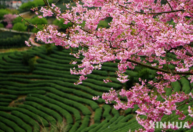[장핑(중 푸젠성)=신화/뉴시스]경칩인 5일(현지시간) 중국 푸젠성 장핑시 용푸의 한 차 농장에 벚꽃이 피고 있다. 2020.03.06.