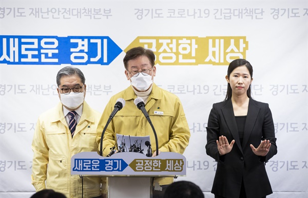 | ▲ 이재명 경기도지사와 이재정 경기도교육감이 6일 오전 경기도청 브리핑룸에서 코로나19 관련 학원의 휴원 협조를 촉구는 합동 기자회견을 하고 있다. |
