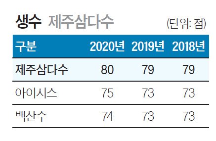 제주삼다수 생수 업종의 NBCI 평균은 76점으로 전년 대비 1점 상승했다. 제주삼다수가 전년 대비 1점 상승한 80점으로 1위를 지켰다. 아이시스는 전년 대비 2점 상승한 75점으로 2위, 백산수는 전년 대비 1점 상승한 74점으로 3위로 평가됐다.