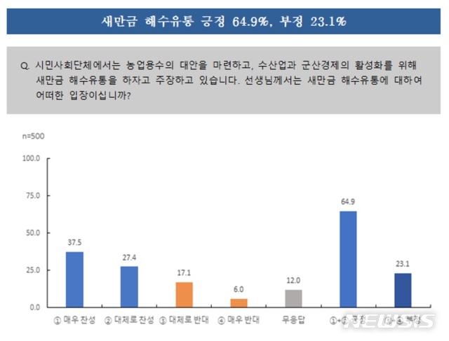 그 결과 새만금 해수유통에 대한 긍정 평가는 64.9%로 집계됐다. 반대는 23.1%였고 무응답은 12%였다.