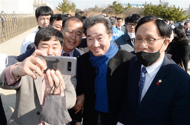“국민을 지킵니다” - 더불어민주당 이낙연 상임선대위원장이 29일 호남지역 후보지원 첫 방문지인 전북 군산의 현대중공업 군산조선소 앞에서 시민들과 사진을 찍고 있다.군산 뉴스14·15 총선 후보등록을 마치고 첫 주말을 맞은 29일 각 당은 지도부를 중심으로 후보 지원에 나서는 등 본격적인 선거전에 돌입했다. 여야 1, 2당의 대결 구도가 강화된 가운데 더불어민주당은 가장 먼저 호남으로 달려가 지지를 호소했고, 미래통합당은 정부의 실정을 강조하며 “못살겠다, 갈아보자”는 구호까지 꺼냈다.