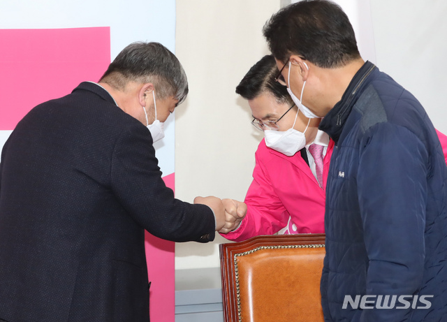 [서울=뉴시스] 고승민 기자 = 황교안 미래통합당 대표, 김동명 한국노총 위원장이 6일 서울 여의도 국회에서 면담을 하기 전 인사를 하고 있다. 2020.04.06.