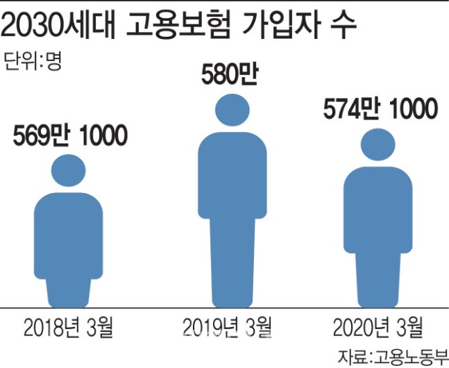 코로나19로 인한 경제적 피해가 눈덩이처럼 커지면서 빠르게 증가하던 고용보험 가입자 수 증가 폭이 둔화하고 있다. 지난달 고용보험 신규 가입자수는 2004년 이후 16년 만에 가장 적었다. 특히 2030세대 청년층은 코로나19 여파로 기업들이 신규 채용을 축소하거나 연기한 영향으로 고용보험 가입자가 지난해보다 오히려 감소했다. 가뜩이나 경기침체로 어려움을 겪고 있던 제조업 역시 코로나19가지 겹치면서 7개월째 고용보험 가입자 수가 줄었다. 고용보험 가입자가 줄었다는 것은 취업자수보다 실직자가 더 많았다는 얘기다.