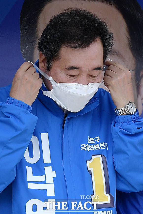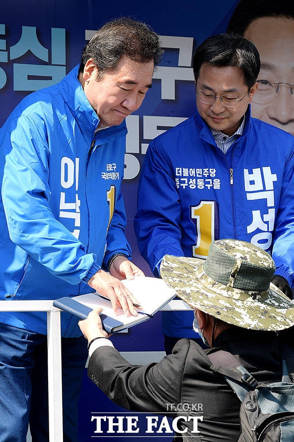 [더팩트|이선화 기자] 이낙연 더불어민주당 공동상임선대위원장이자 종로구 국회의원 후보가 14일 오후 서울 종로구 마전교 인근에서 박성준 중구성동구을 국회의원 후보와 합동 유세를 하며 유권자와 인사를 나누고 있다.