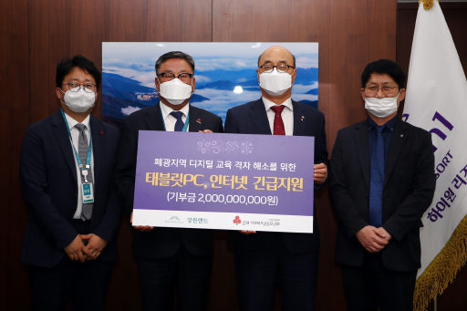 강원랜드 폐광지 학생 정보화기기 긴급지원 ◇강원랜드가 21일 본사 행정동에서 폐광지역 정보화기기 긴급지원에 필요한 20억원을 강원사회복지공동모금회에 지정 기탁했다. 코로나19로 인해 사상 첫 온라인 개학을 맞은 가운데 강원랜드가 전국 폐광지역 7개 시·군 초·중·고교에 정보화기기를 긴급 지원한다.