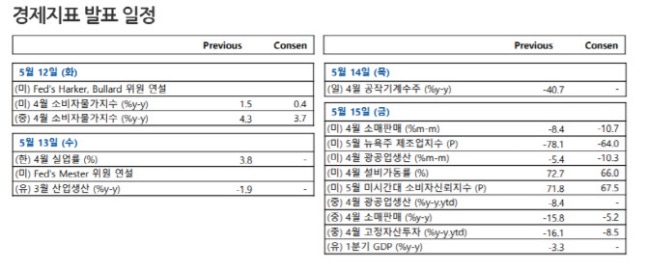 한편 중요한 또 한가지 이슈는 중국의 4월 주요 경제지표다. 김 연구원은 “생산은 3월부터 개선되겠지만 중소기업은 여전히 정상수준으로 회복되지 못했다”며 “4월 소매판매도 -6.0%으로 예상한다”고 말했다.