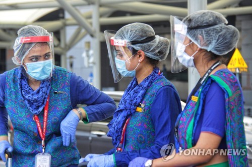 Flight crew members are seen at the Indira Gandhi international airport where stranded Indian passengers from Singapore arrived, in New Delhi, India, 08 May 2020. India has started a very large scale of air evacuation operations from 07 May for repatriation of stranded abroad passengers. EPA/STR