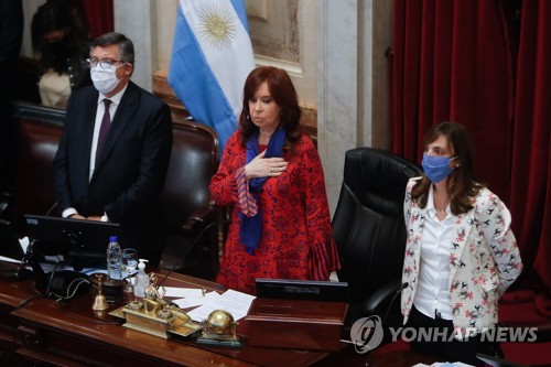 The President of the Argentine Senate, Cristina Fernandez de Kirchner (C), listens to the country's anthem during the first virtual session in the history of said legislative chamber, due to the COVID-19 pandemic, in Buenos Aires, Argentina, 13 May 2020. EPA/Juan Ignacio Roncoroni