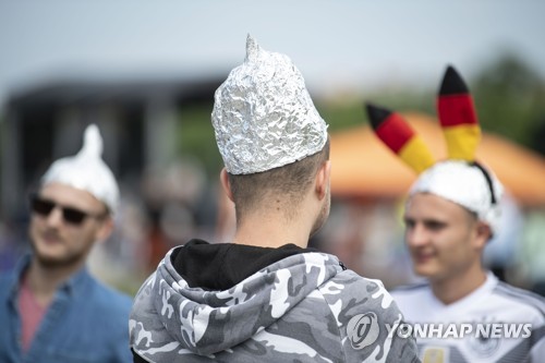 People waering Aluminium foil hats during a demonstration against coronavirus restrictions at the Theresienwiese in Munich, Bavaria, Germany, 16 May 2020. Around 1000 authorized demonstrators took part in the demonstration, which was against the current measures to contain the spread of the coronavirus SARS-CoV-2, which causes Covid-19 disease. Others gathered outside the cordoned-off Theresienwiese. EPA/LUKAS BARTH-TUTTAS