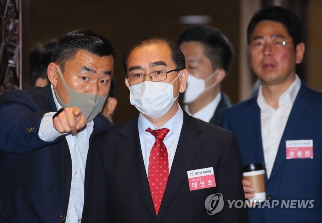 (서울=연합뉴스) 진성철 기자 = 미래통합당 태영호 당선인(가운데)이 21일 국회 예결위회의장에서 열린 제21대 국회 당선자 워크숍에 참석하고 있다. 2020.5.21