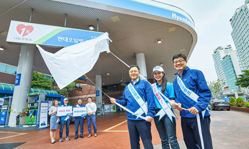 1일 서울 강남구 오천주유소에서 현대오일뱅크 강달호 사장(앞줄 왼쪽)과 한환규 부사장(〃 오른쪽) 등 임직원들이 새 간판을 선보이고 있다. 현대오일뱅크는 이날부터 오천주유소 등 SK네트웍스 주유소 300여개 운영권을 인수, 영업을 시작했다. 현대오일뱅크 국내 주유소는 2500여개로 GS칼텍스를 제치고 2위로 올라섰다.