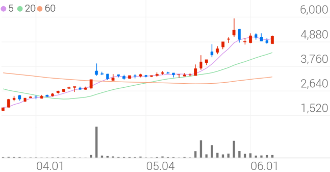 | 06월 04일 | 4,850 | -1.52% | | 06월 03일 | 4,925 | -3.05% | | 06월 02일 | 5,080 | -1.17% | | 06월 01일 | 5,140 | +5.22% | | 05월 29일 | 4,885 | -2.30% | [이 기사는 증권플러스(두나무)가 자체 개발한 로봇 기자인 'C-Biz봇'이 실시간으로 작성했습니다.] [C-Biz봇] [ 네이버 메인에서 조선비즈 받아보기] [ 조선비즈 바로가기] chosunbiz.com