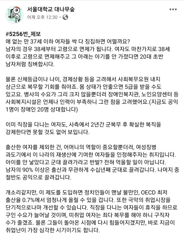작성자는 “남자는 38세부터 고령으로 군 면제가 된다. 여자도 마찬가지로 38세 이후에 고령으로 면제해주고 그 아래는 아기를 안 가졌다면 20대 초반 남자처럼 징병하자”고 말했습니다.