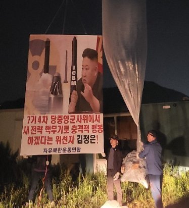 ‘자유북한운동연합’ 8명 회원과 ‘대북풍선단-서정갑’ 회원 3명 등 11명은 지난달 31일 오전 1시쯤 경기도 김포시 월곶면 성동리에서 ’새 전략핵무기 쏘겠다는 김정은“라는 제목의 대북전단 50만장을 살포했다. 사진 자유북한운동연합 한국의 탈북민단체가 접경지역에서 북한을 향해 날려 보내는 '대북전단'(삐라) 살포 행위에 대해 북한이 연일 강도 높게 문재인 정부를 비난하고 있다. 북한은 '선전포고'라는 문구까지 쓰면서 한국 정부에 삐라 근절을 촉구했다.