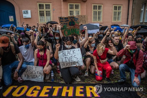 People protest during a solidarity rally against police and racial violence in the United States, in Prague, Czech Republic, 13 June 2020. Hundreds of protesters gathered in commemoration of the death of George Floyd, an African-American man who died while in Minneapolis police custody on 25 May after the arresting officer knelt on his neck for 8 minutes. The brutal killing of an African American man has sparked world wide anger resulting in Black Lives Mater and anti Police brutality protests all over the world. EPA/MARTIN DIVISEK
