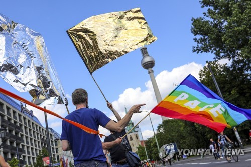 People take part in the 'Unteilbar' (lit. indivisible) 'Solidarity Chain' demonstration near Alexanderplatz square in Berlin, Germany, 14 June 2020. The protesters wish to bring attention to a variety of social and economical issues, from better working conditions, fair tax policy and debt relief to issues such as protection for refugees and societal pact against: racism, anti-Semitism and right-wing terrorism. The participants held bands of tape between one another in distances of 3 meter as a health safety measure, thus forming a chain some 9km long from the German capital district of Mitte to Kreuzberg. EPA/OMER MESSINGER