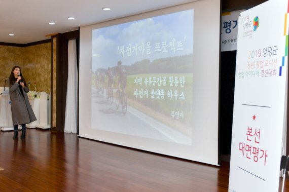 양평군 청년창업오디션. 사진제공=양평군 올해 초 불청객으로 찾아온 코로나19로 인해 전국은 몸살을 앓았다. 양평군은 천마스크 제작 자원봉사단 ‘천군마마’를 발족해 300여명의 자원봉사자가 천마스크를 제작에 뛰어들었다. 학교에 열화상 카메라 설치, 선별진료소 운영, 자가격리자 관리와 양평군 재난기본소득 141억원을 포함해 총 546억원을 군민 안전에 투입했다.
