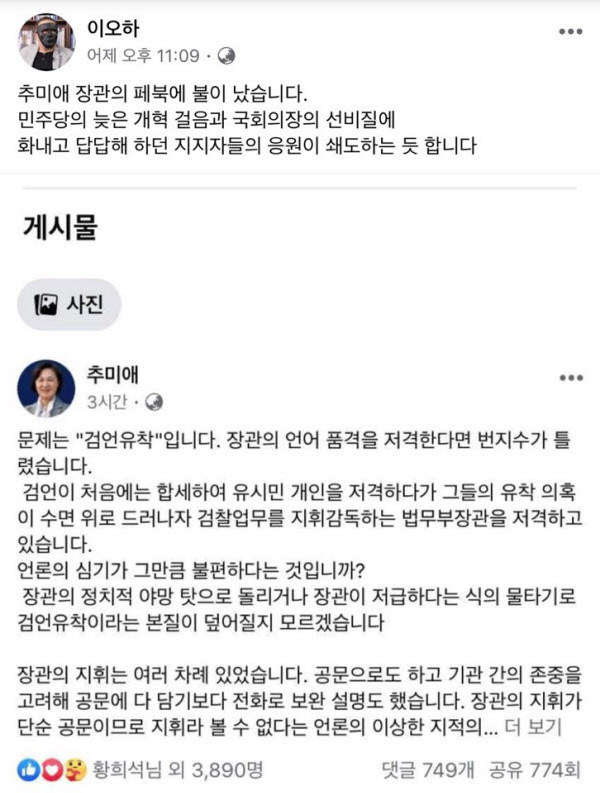 MBC에 이른바 '검언 유착' 의혹을 제보했던 '제보자X' 지모씨가 추 장관의 페이스북의 글을 27일 공유했다. 지씨는 페이스북에서 '이00'이란 이름으로 활동하고 있다. 추 장관의 글엔 지씨와 지씨 변호인인 황희석 열린민주당 최고위원이 '좋아요'를 눌렀다. ‘검찰이 나경원 전 의원을 소환하면 출두하겠다’며 소환에 불응 중인 지씨는 지난 25일 밤 서울 대학로의 한 주점에 있으면서 ‘서울지검 검사님들, 여기 오시면 현장체포 가능합니다’는 글을 페이스북에 올리기도 했다.