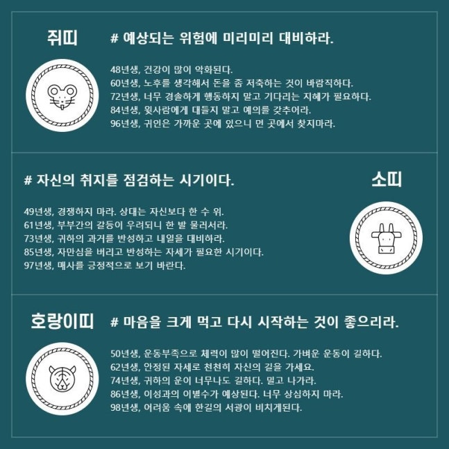 소띠 # 자신의 취지를 점검하는 시기이다. 49년생, 경쟁하지 마라. 상대는 자신보다 한 수 위.