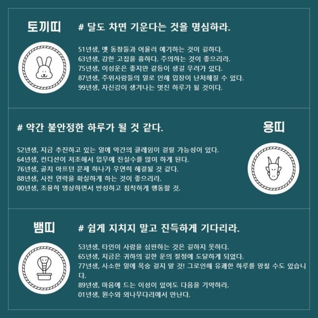 용띠 # 약간 불안정한 하루가 될 것 같다. 52년생, 지금 추진하고 있는 일에 약간의 클레임이 걸릴 가능성이 있다.